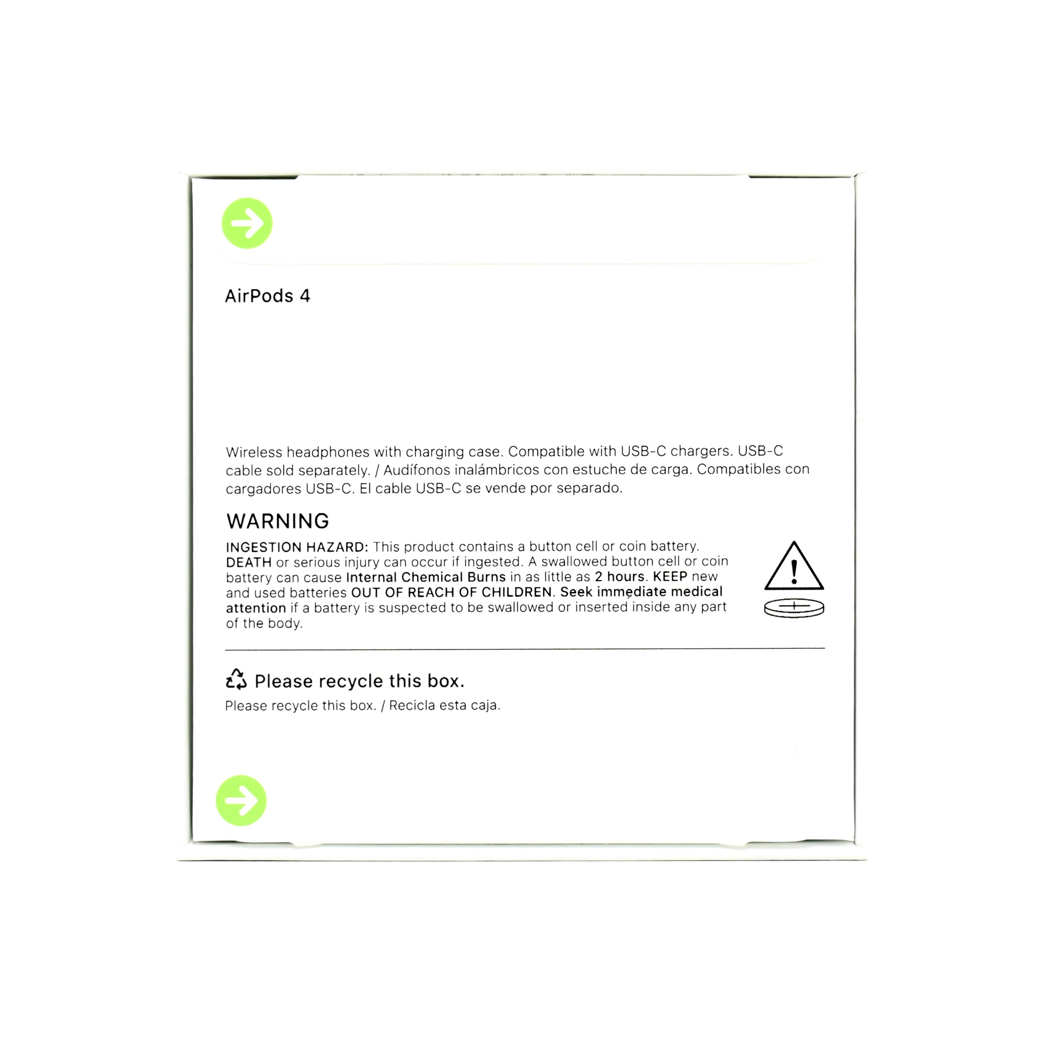 Beginning in 2024 Apple began offering the entry-level AirPods 4 product in two versions: AirPods 4 and AirPods 4 with Active Noise Cancellation. These AirPods 4 are the “base” model without the additional features.