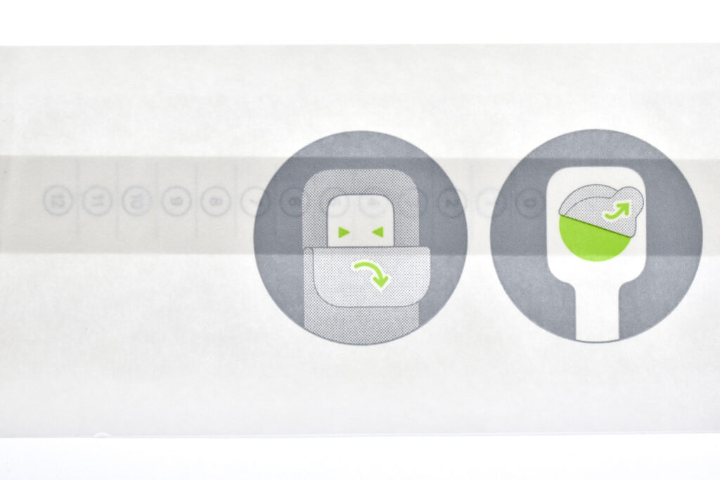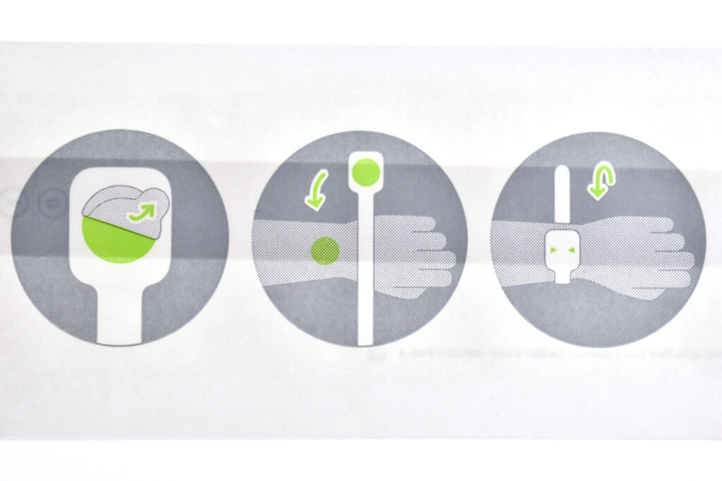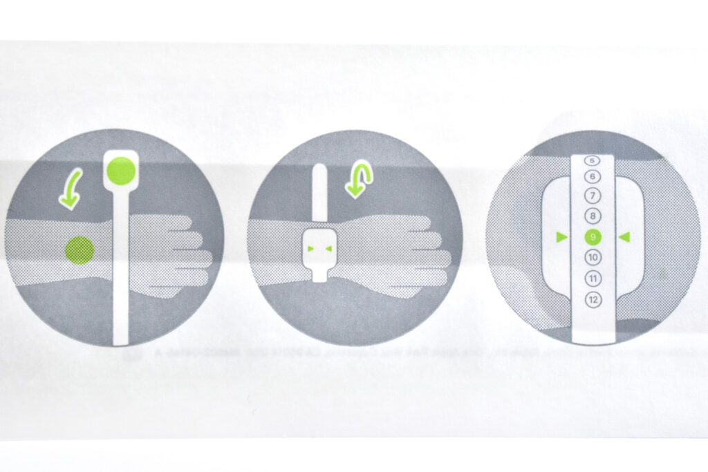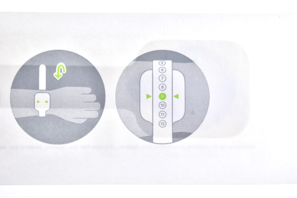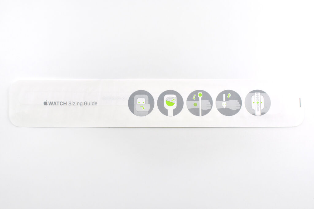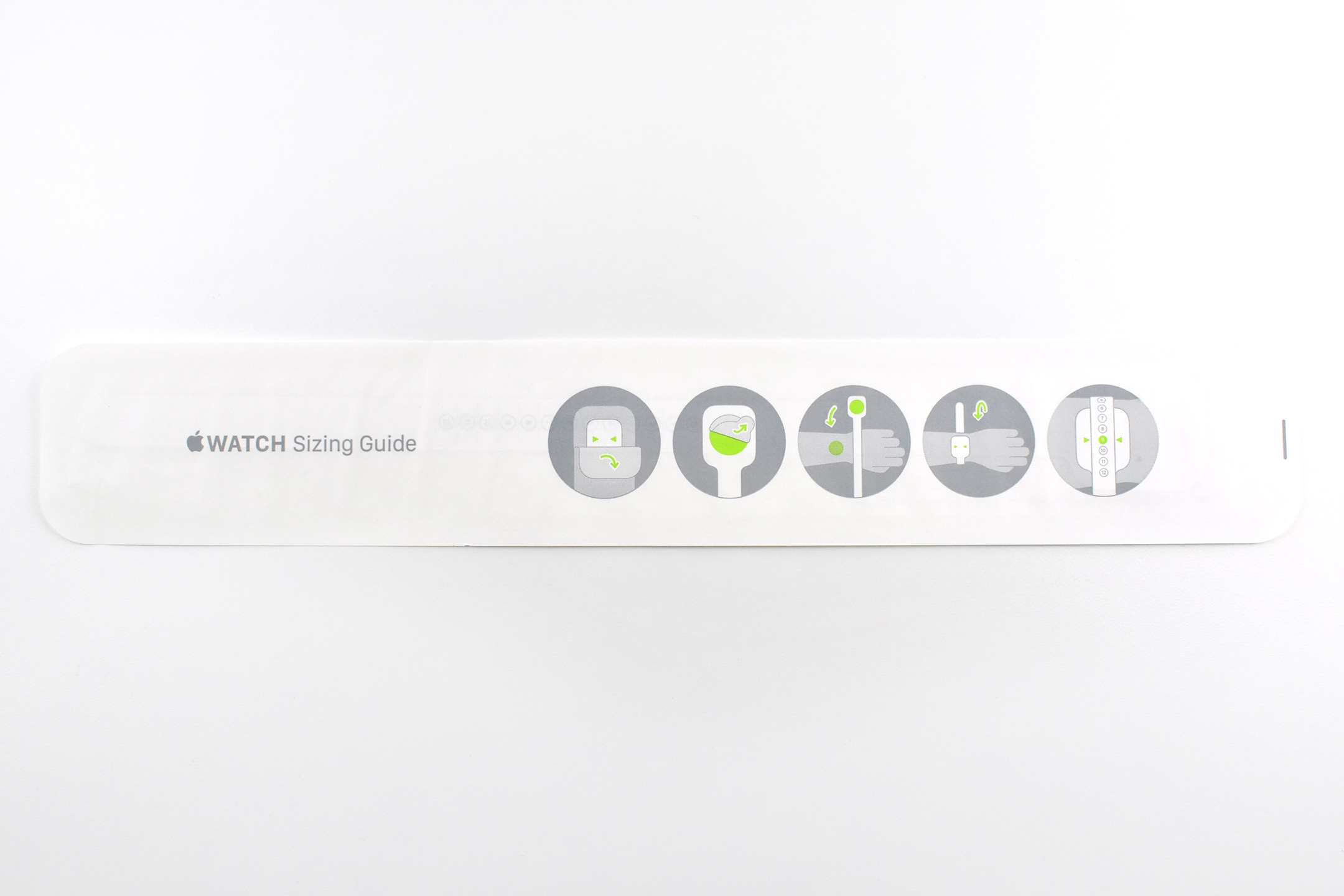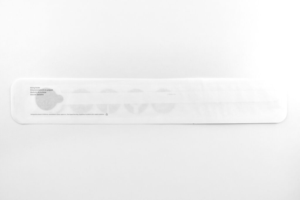 This third Sizing Tool option was available to Apple Store Customers. The tool includes the directions on the outer package, instructing individuals using diagrams to open the package, peel back an adhesive dot, wrap the tool around the wrist, and determine the band size based upon the location of arrows printed on the Sizing Tool.