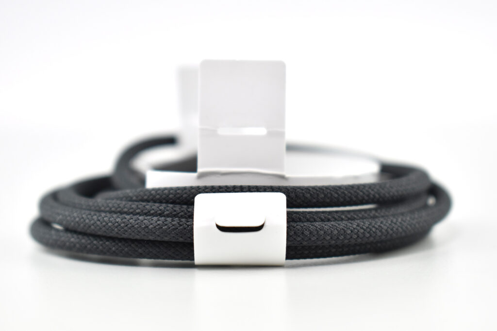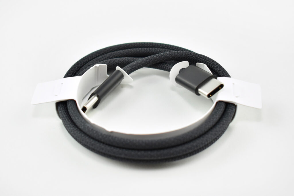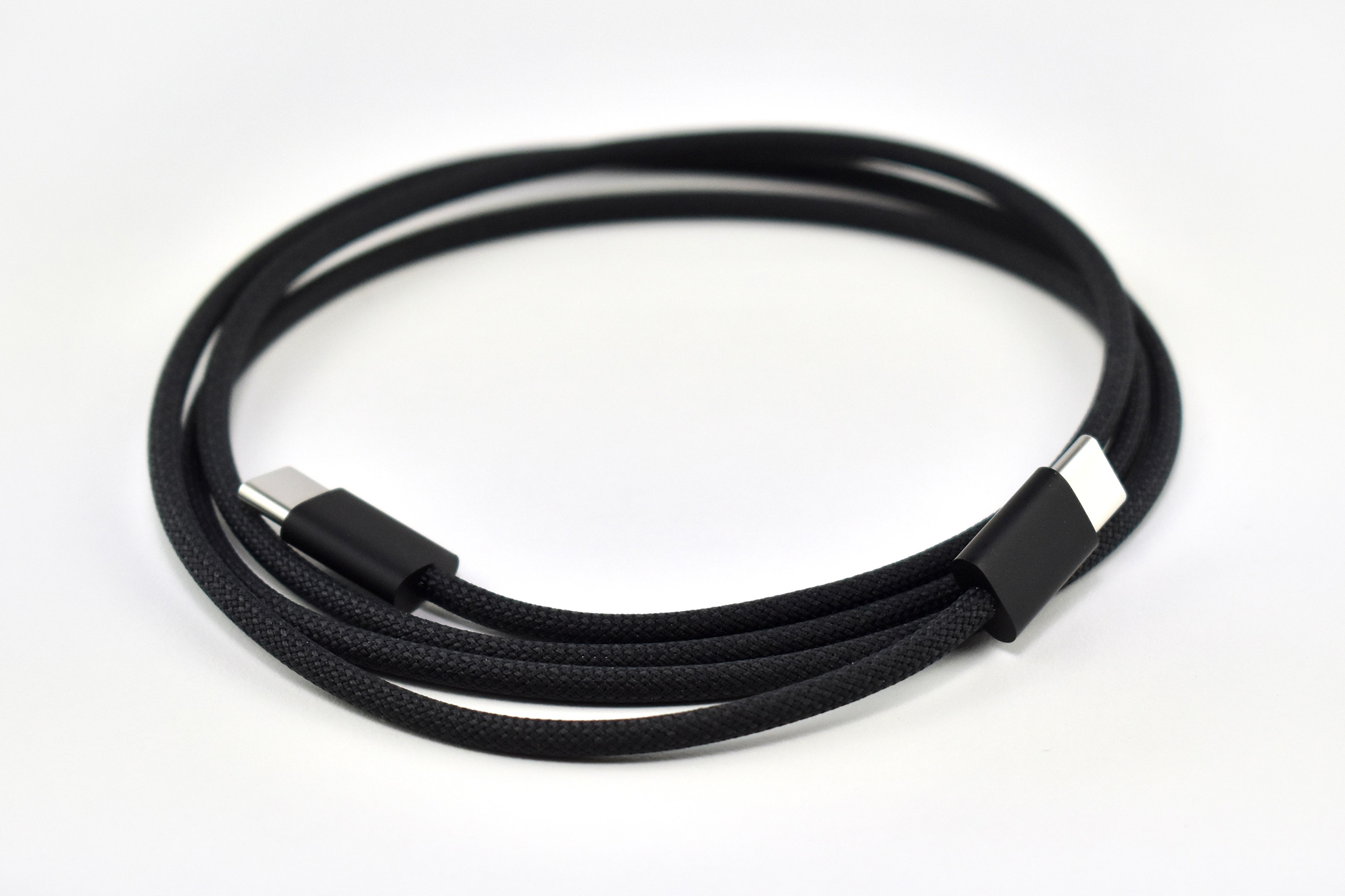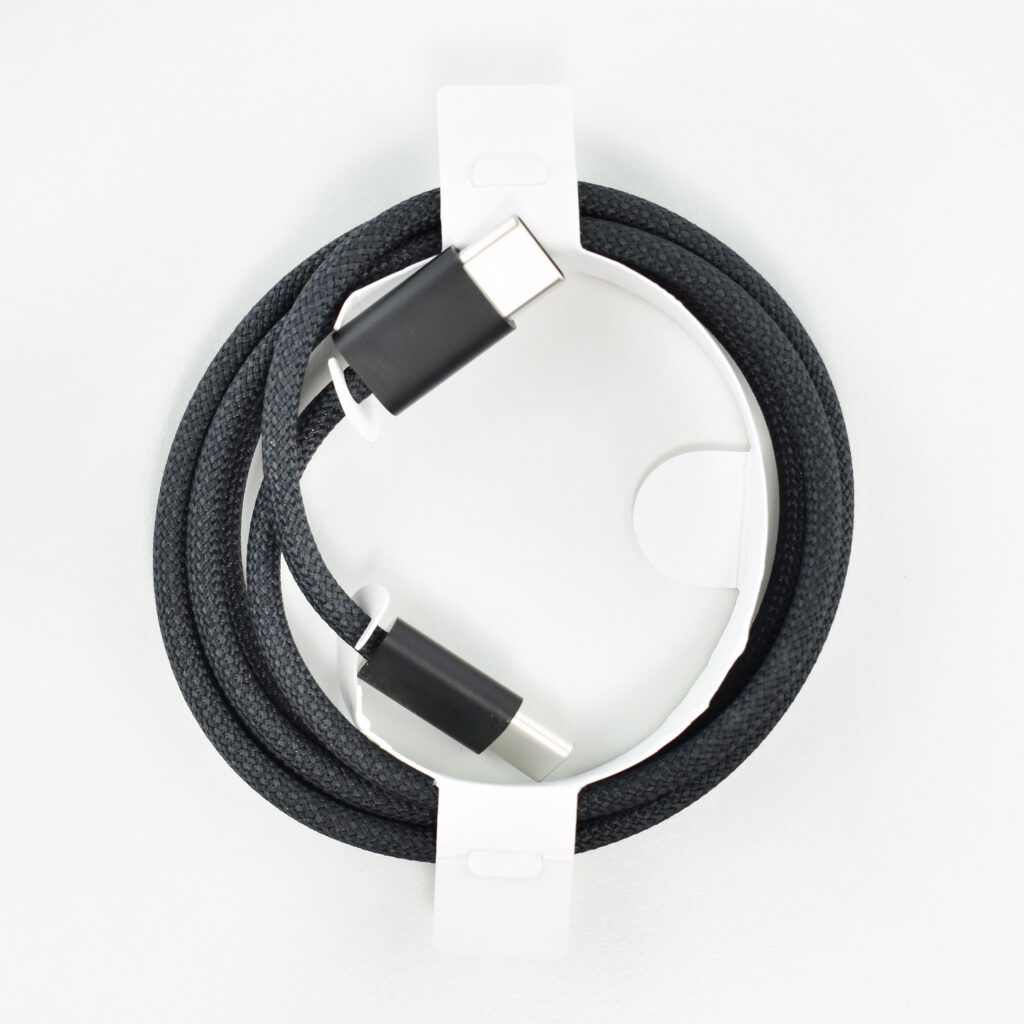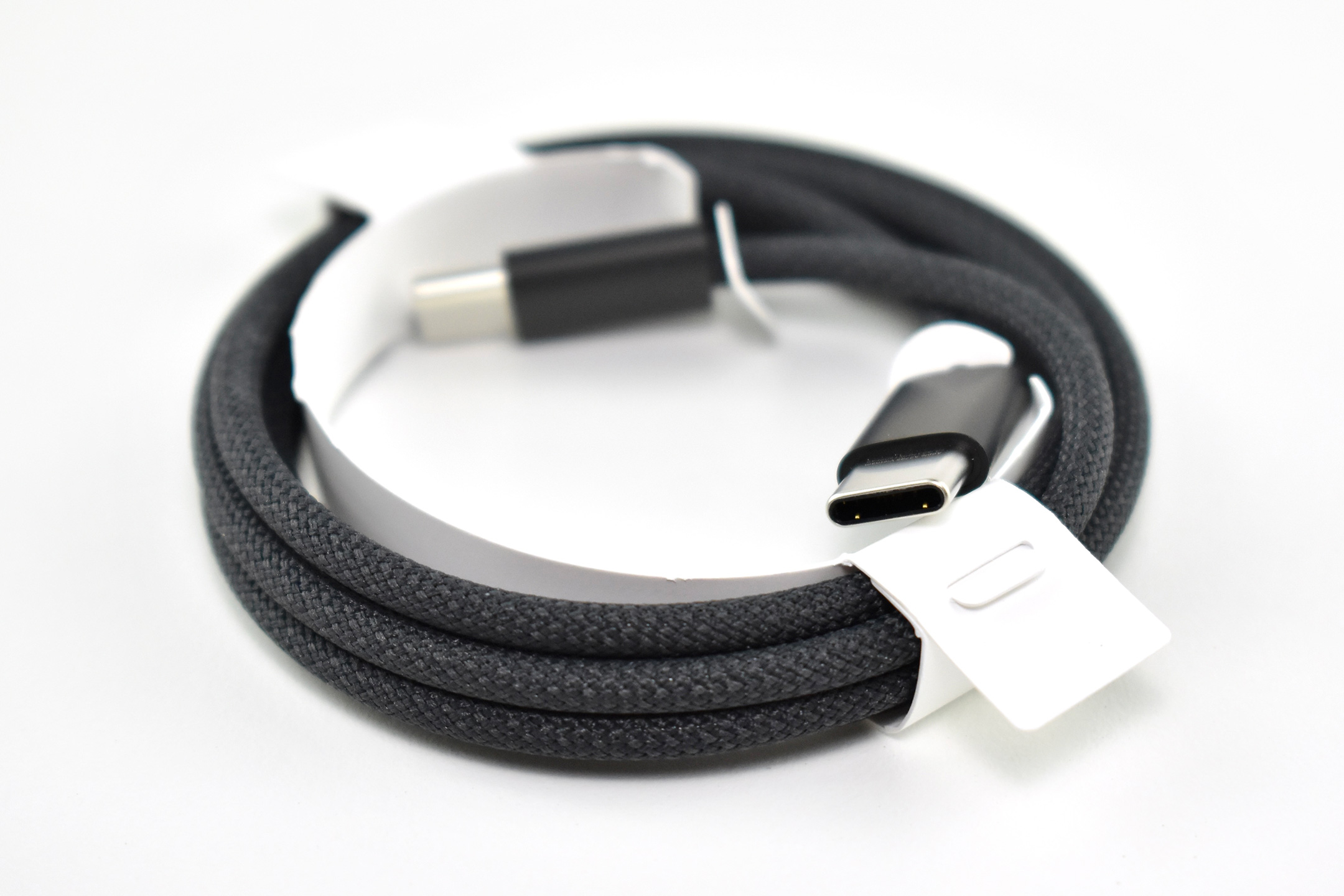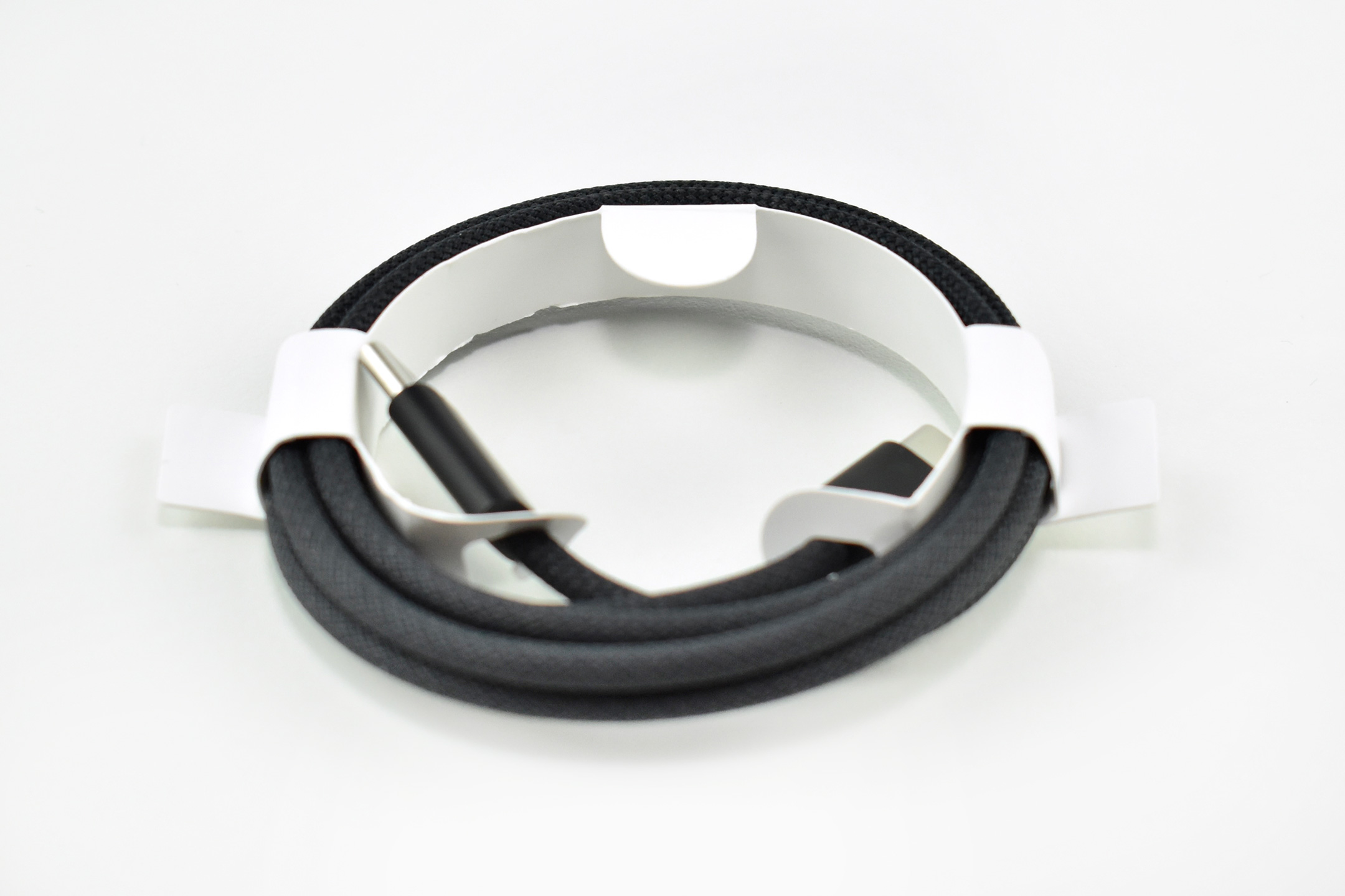 This cable is 1 meter (3.3 feet) long and shipped in bulk packaging—the same cardboard packaging that is used to keep the cable wrapped in a circular package with the USB-C plugs secured inside an Apple box such as an iPad.
