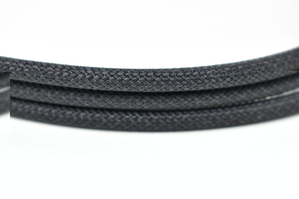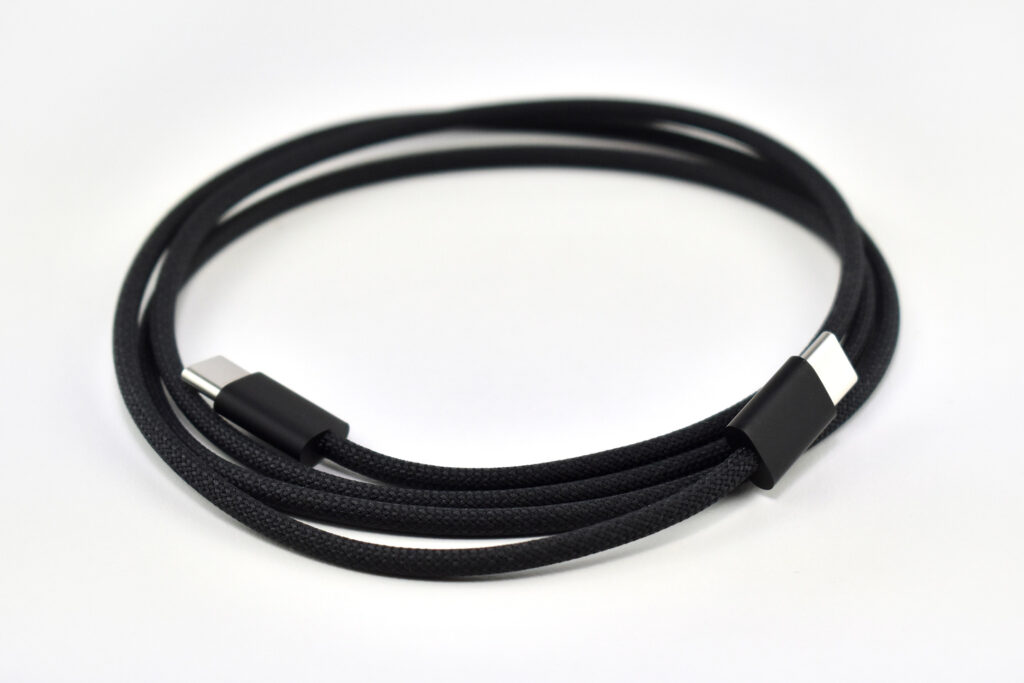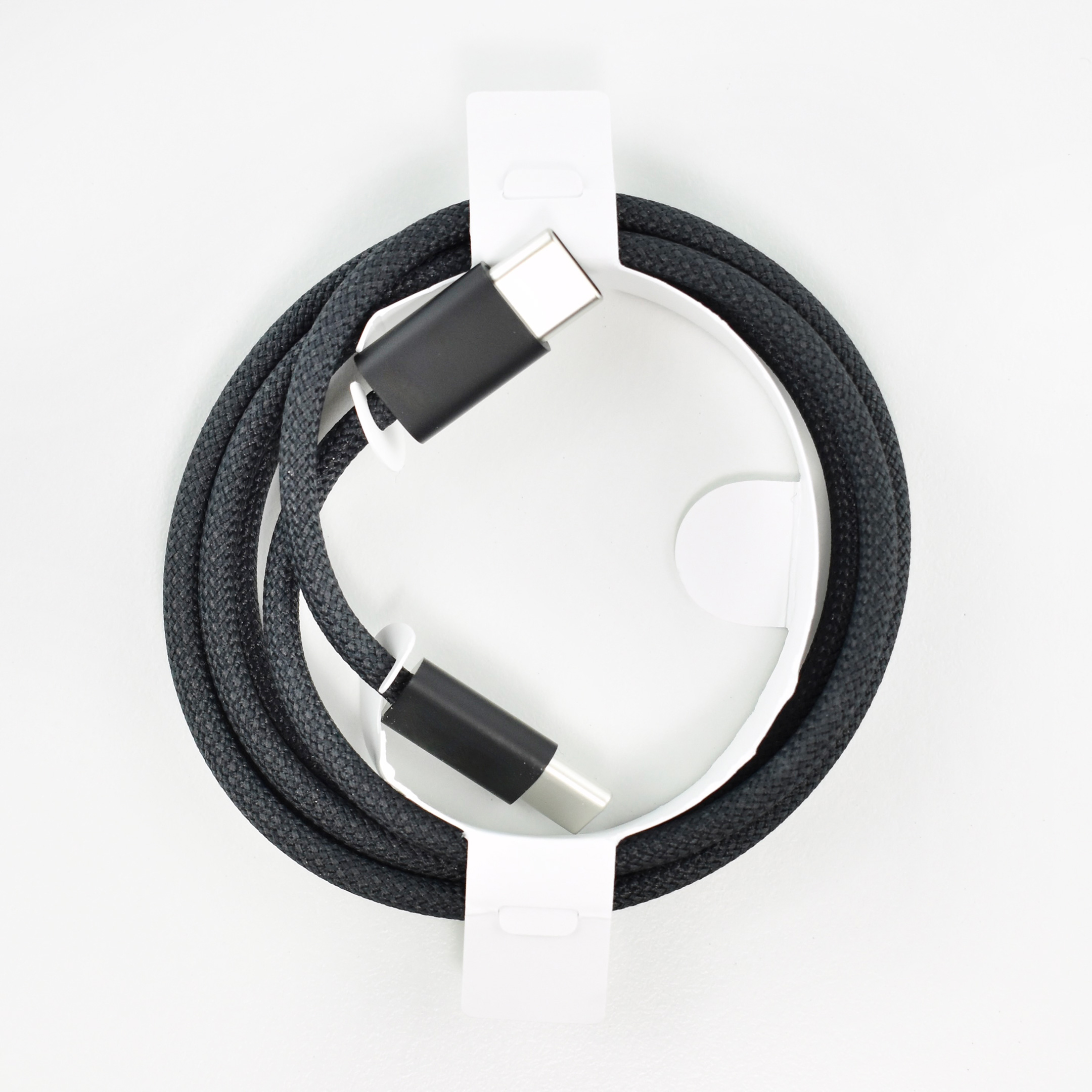This USB-C charging cable was made by Apple in a braided design in black. It has USB-C connectors on both ends and could be used for charging, syncing, and transferring data between USB-C devices. It supported charging of up to 60 watts or USB 2 data transfer. If used with a USB-C power adapter, it can fast-charge devices from a wall outlet.