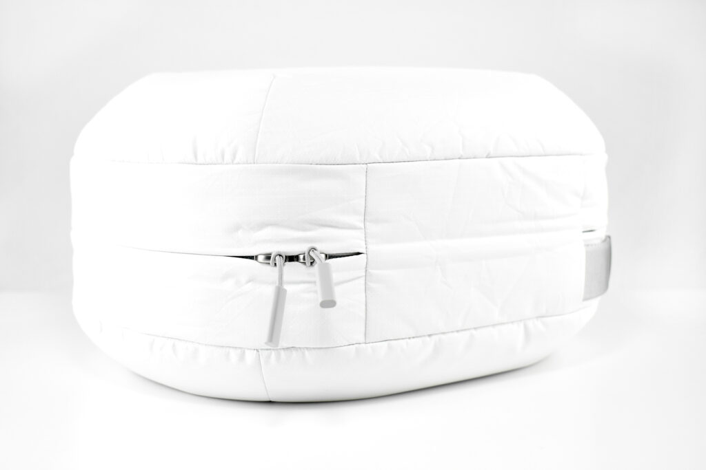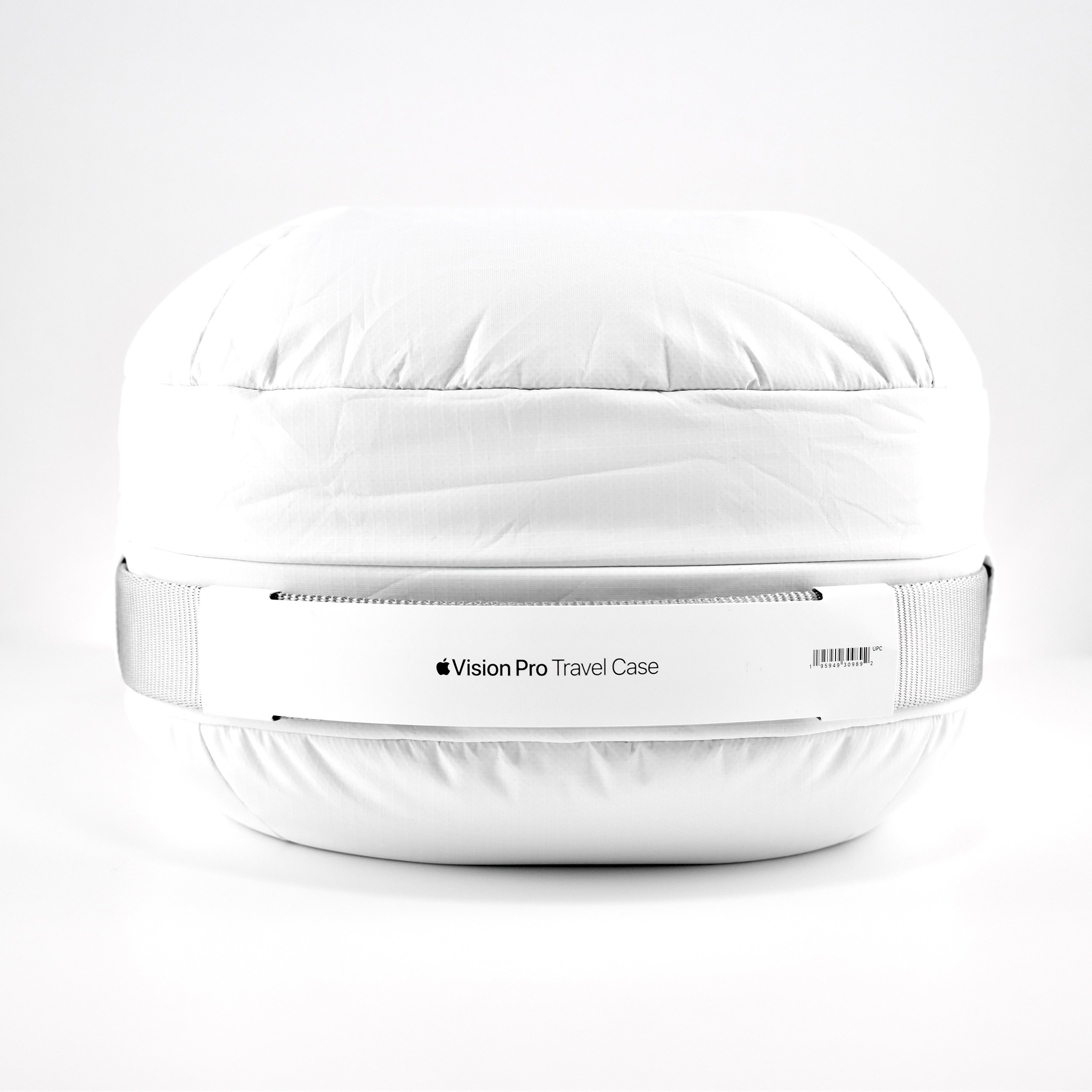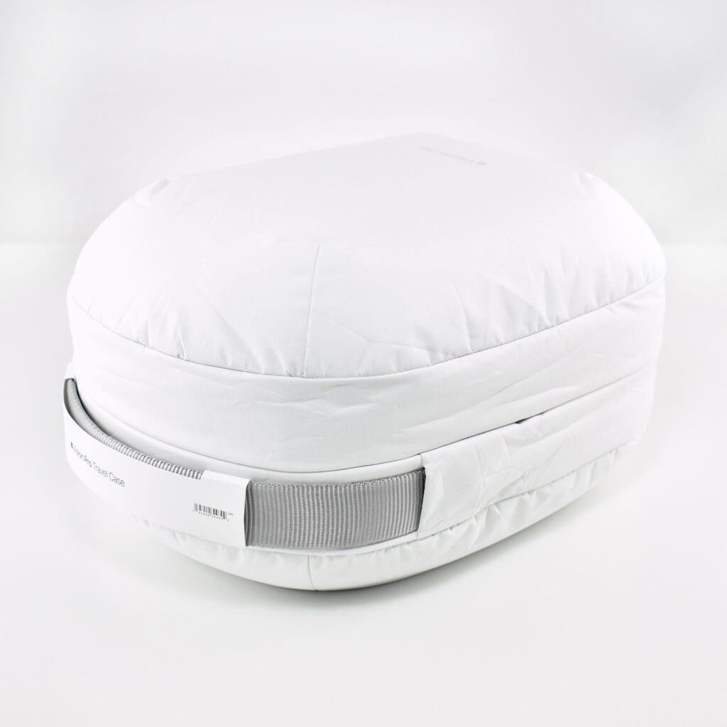 The exterior of the Apple Vision Pro Travel Case uses a material reminiscent of a windbreaker and loosely covers the polycarbonate protective structure. Apple refers to this white covering as “Ripstop,” defined by Wikipedia as “a woven fabric, often made of nylon, using a reinforcing technique that makes it more resistant to tearing and wear.” The case is printed on one side with the words “Apple Vision Pro” in light gray in Apple’s San Francisco font.