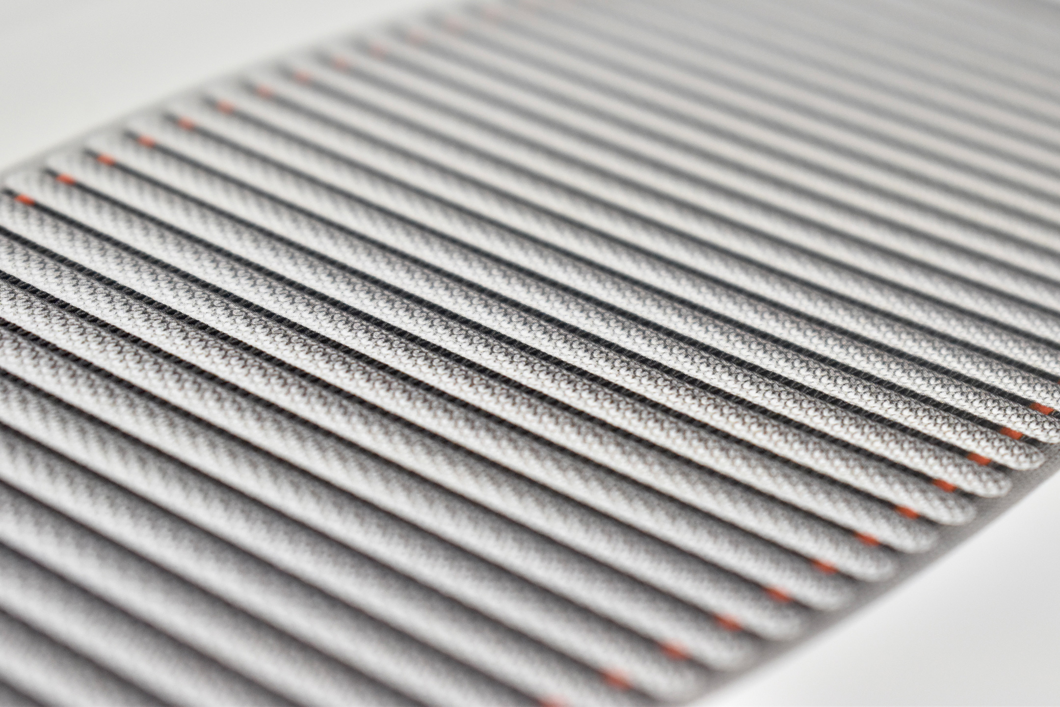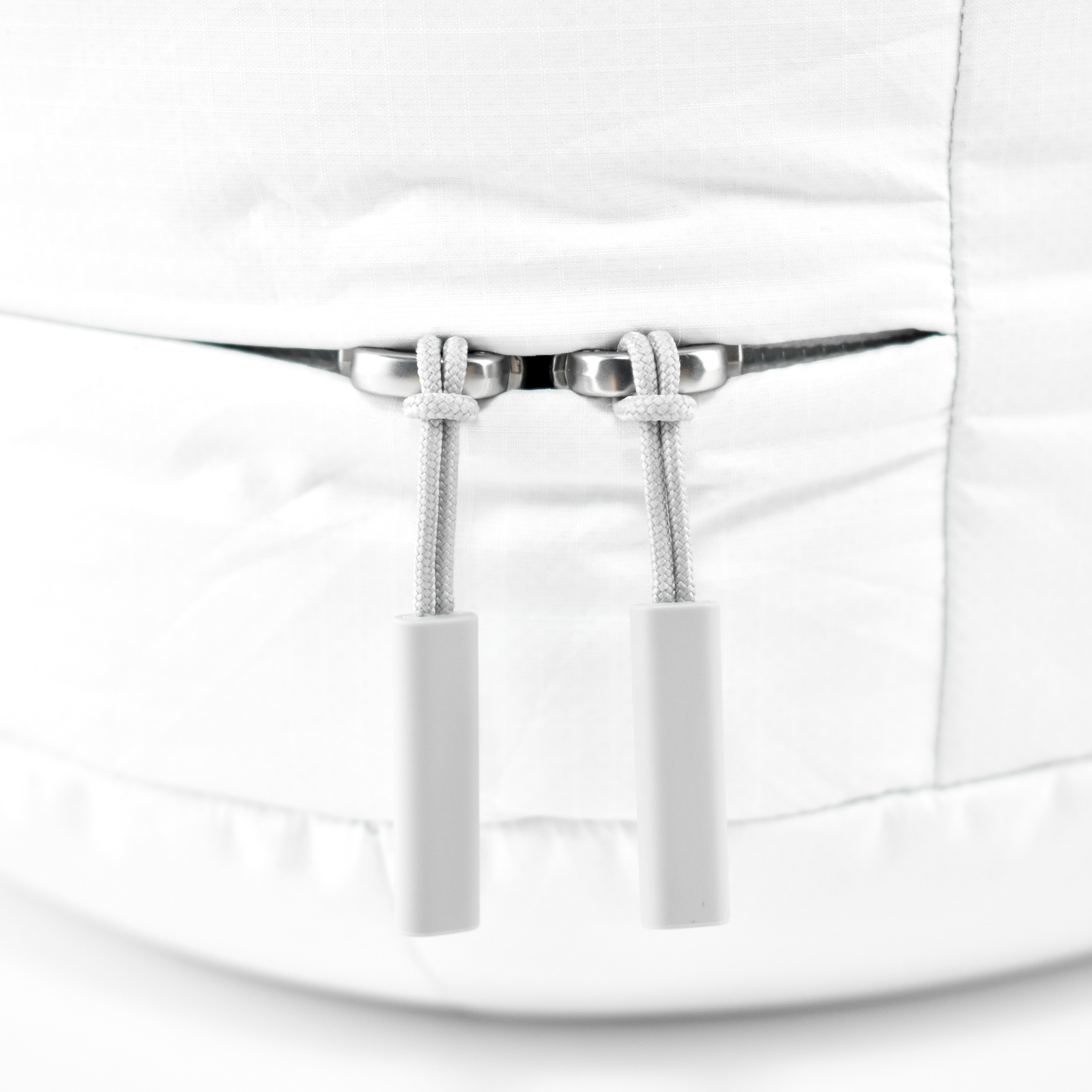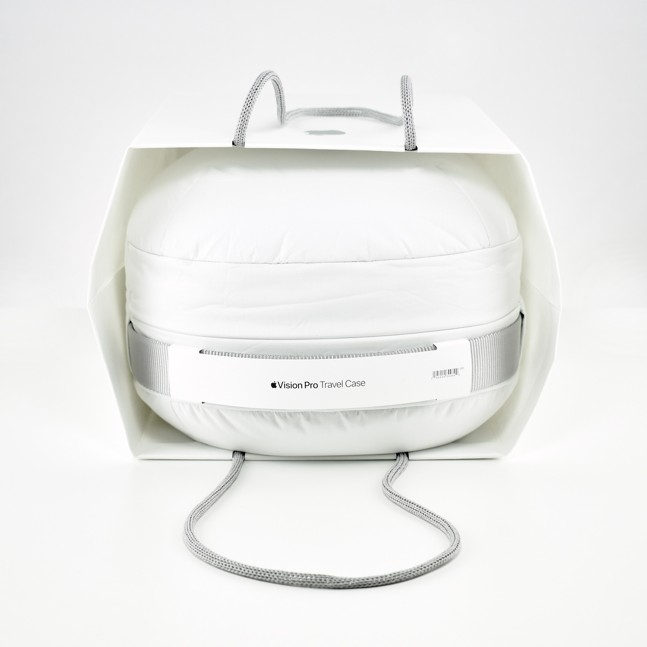 The exterior of the Apple Vision Pro Travel Case uses a material reminiscent of a windbreaker and loosely covers the polycarbonate protective structure. Apple refers to this white covering as “Ripstop,” defined by Wikipedia as “a woven fabric, often made of nylon, using a reinforcing technique that makes it more resistant to tearing and wear.” The case is printed on one side with the words “Apple Vision Pro” in light gray in Apple’s San Francisco font.
