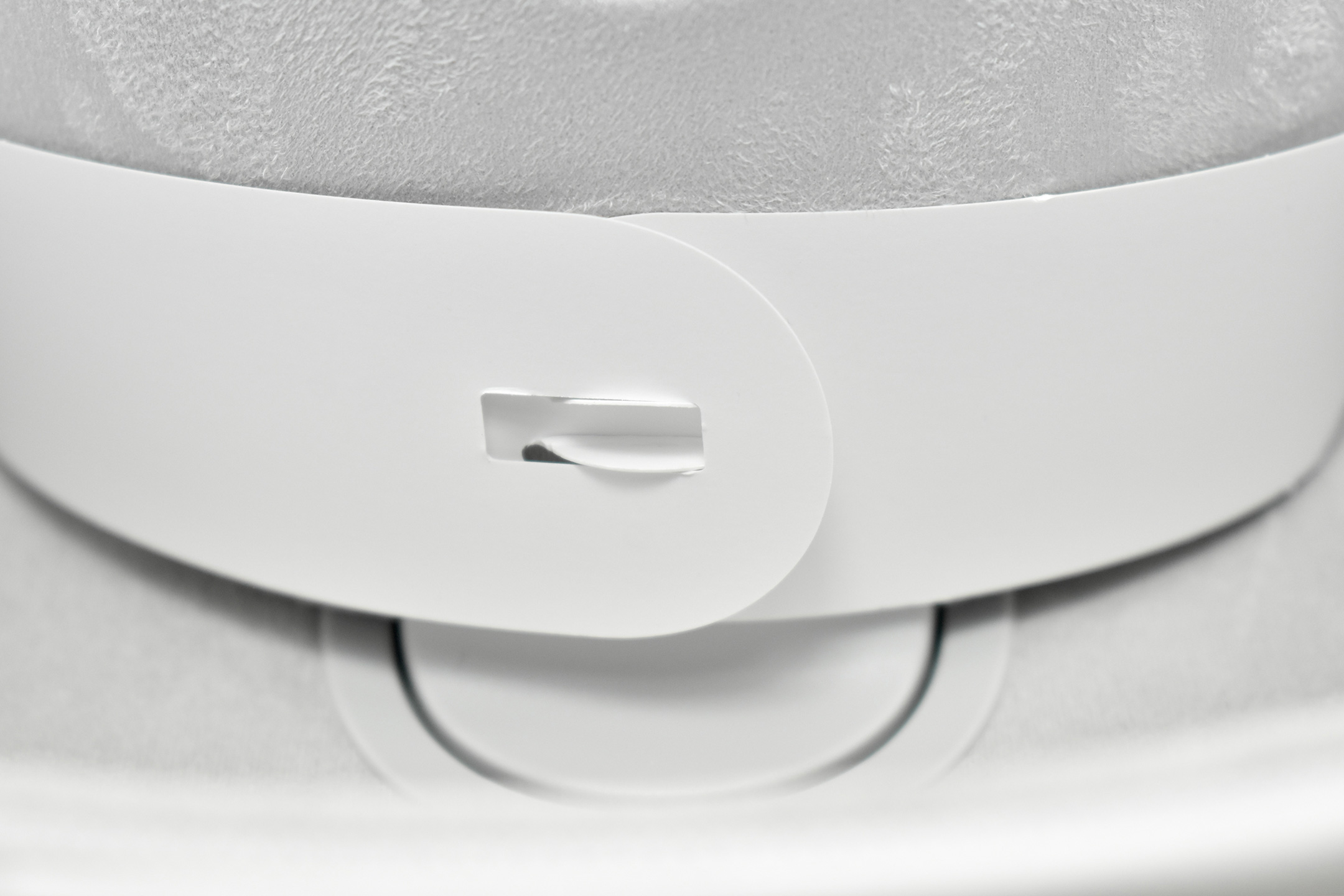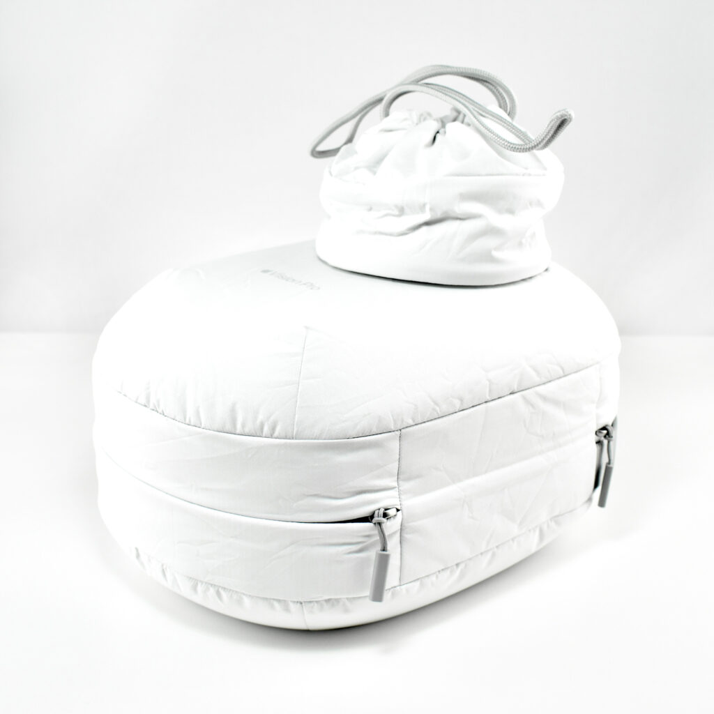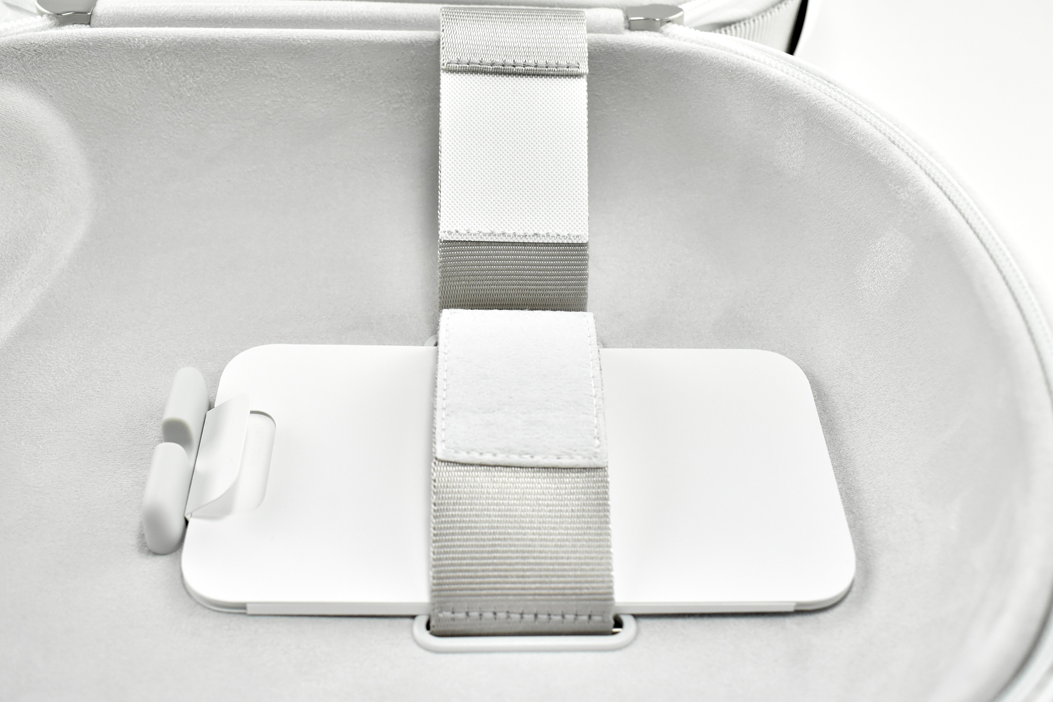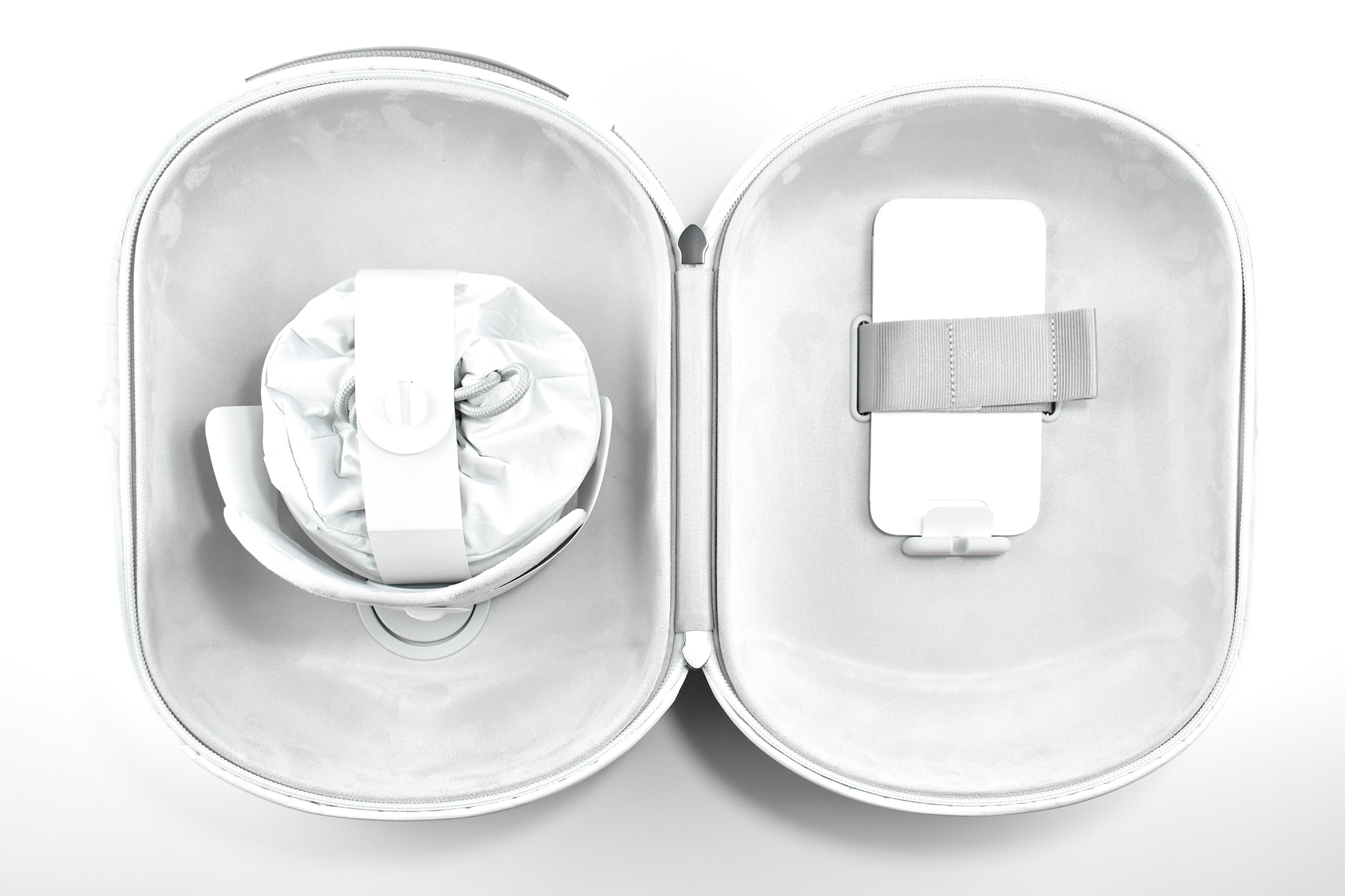 The interior of the Apple Vision Pro Travel Case is lined with microfiber in a color and texture similar to Apple’s infamous polishing cloth. The Apple Vision Pro fits perfectly in the case and includes a velcro strap to securely hold the battery. A white circular drawstring bag fits in the space in the open area between the front of the headset and the headband.