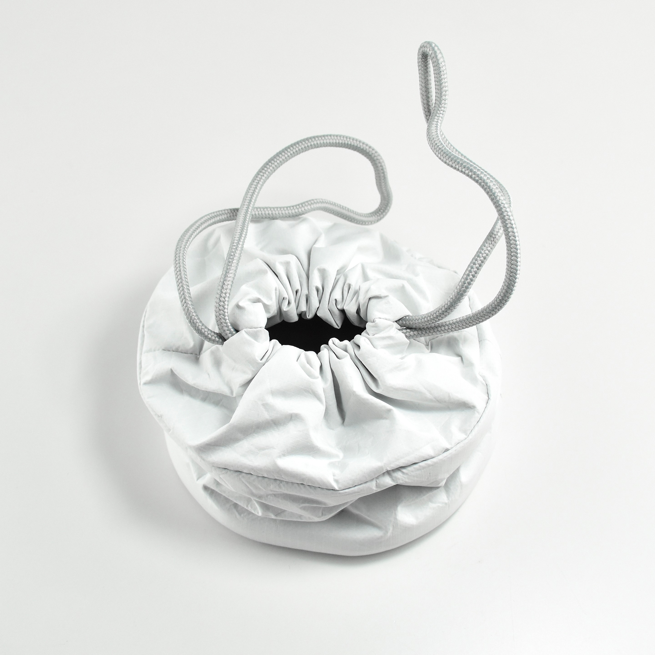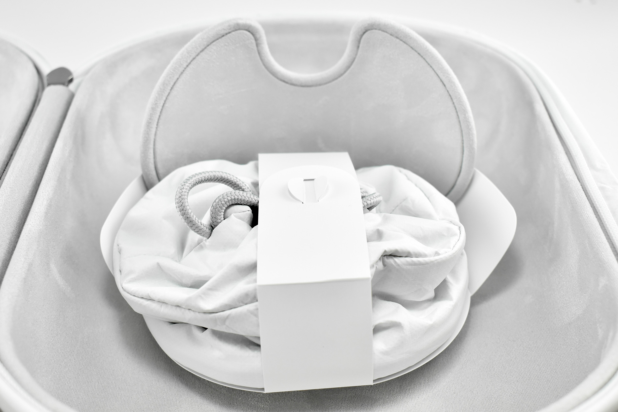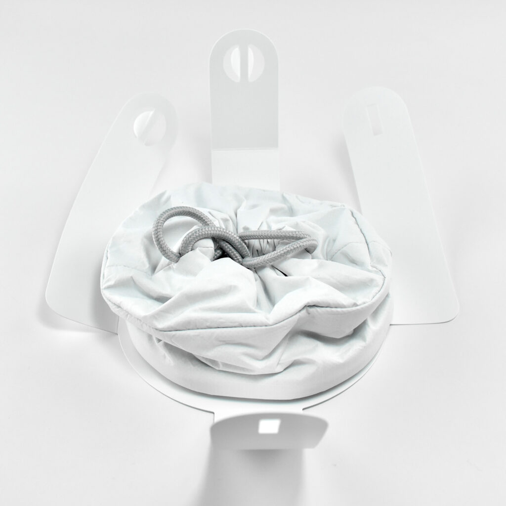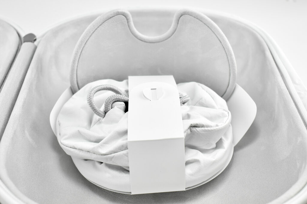 The interior of the Apple Vision Pro Travel Case is lined with microfiber in a color and texture similar to Apple’s infamous polishing cloth. The Apple Vision Pro fits perfectly in the case and includes a velcro strap to securely hold the battery. A white circular drawstring bag fits in the space in the open area between the front of the headset and the headband.