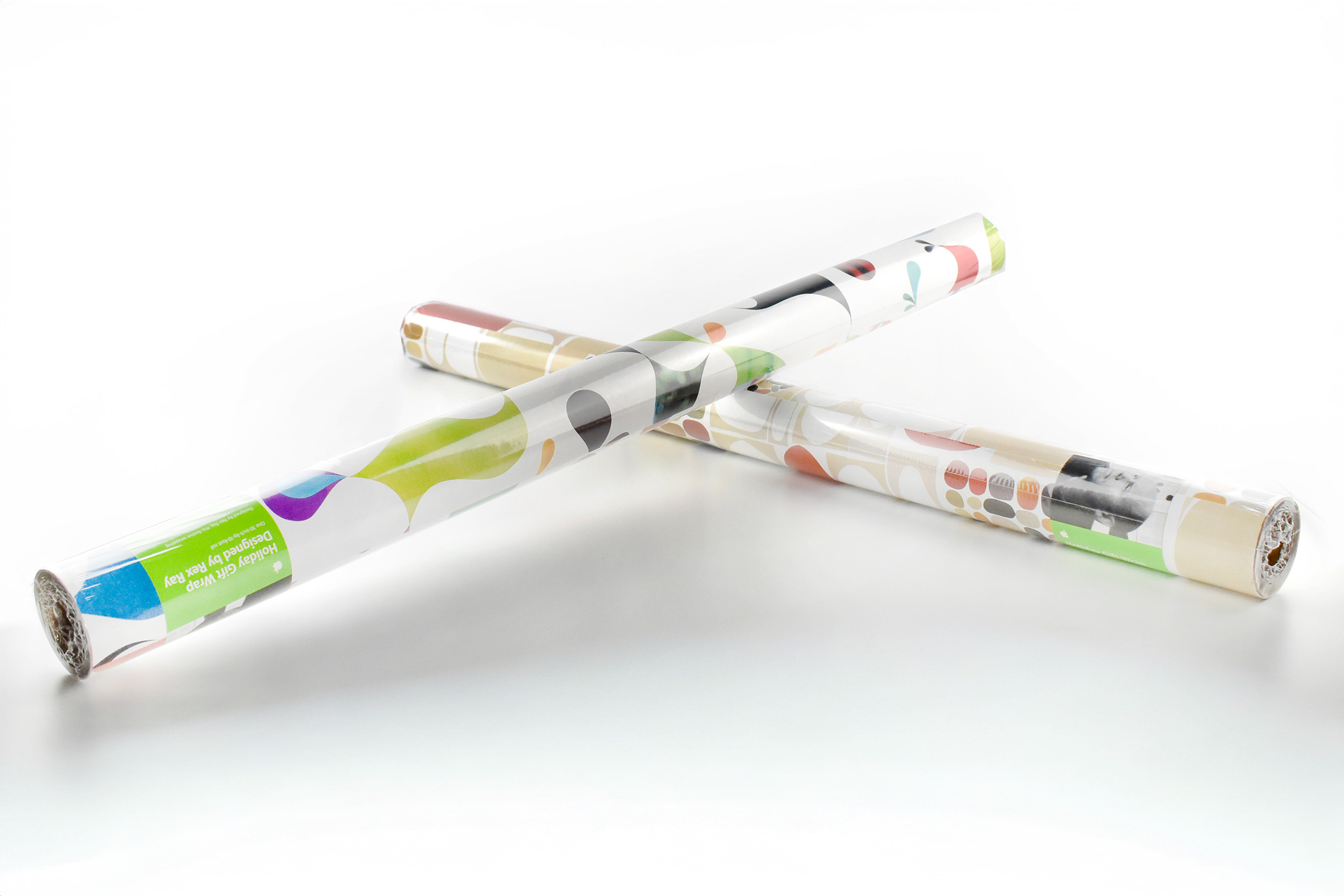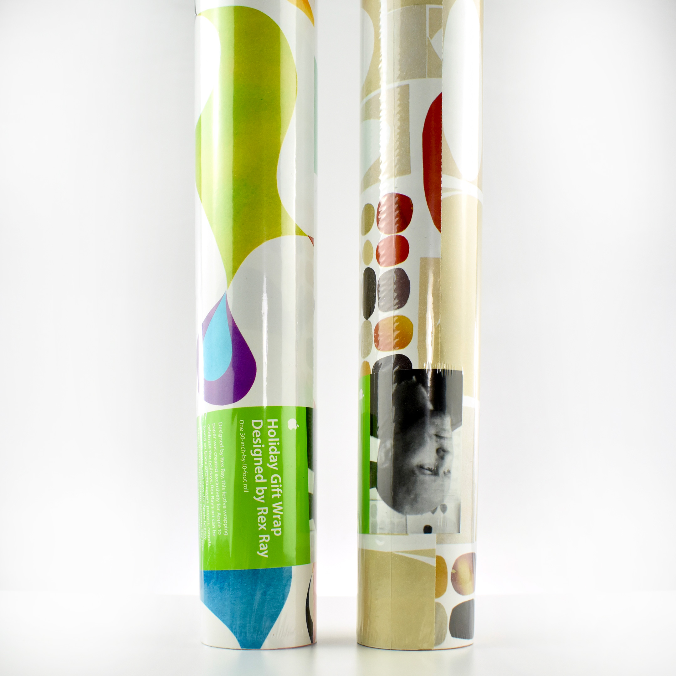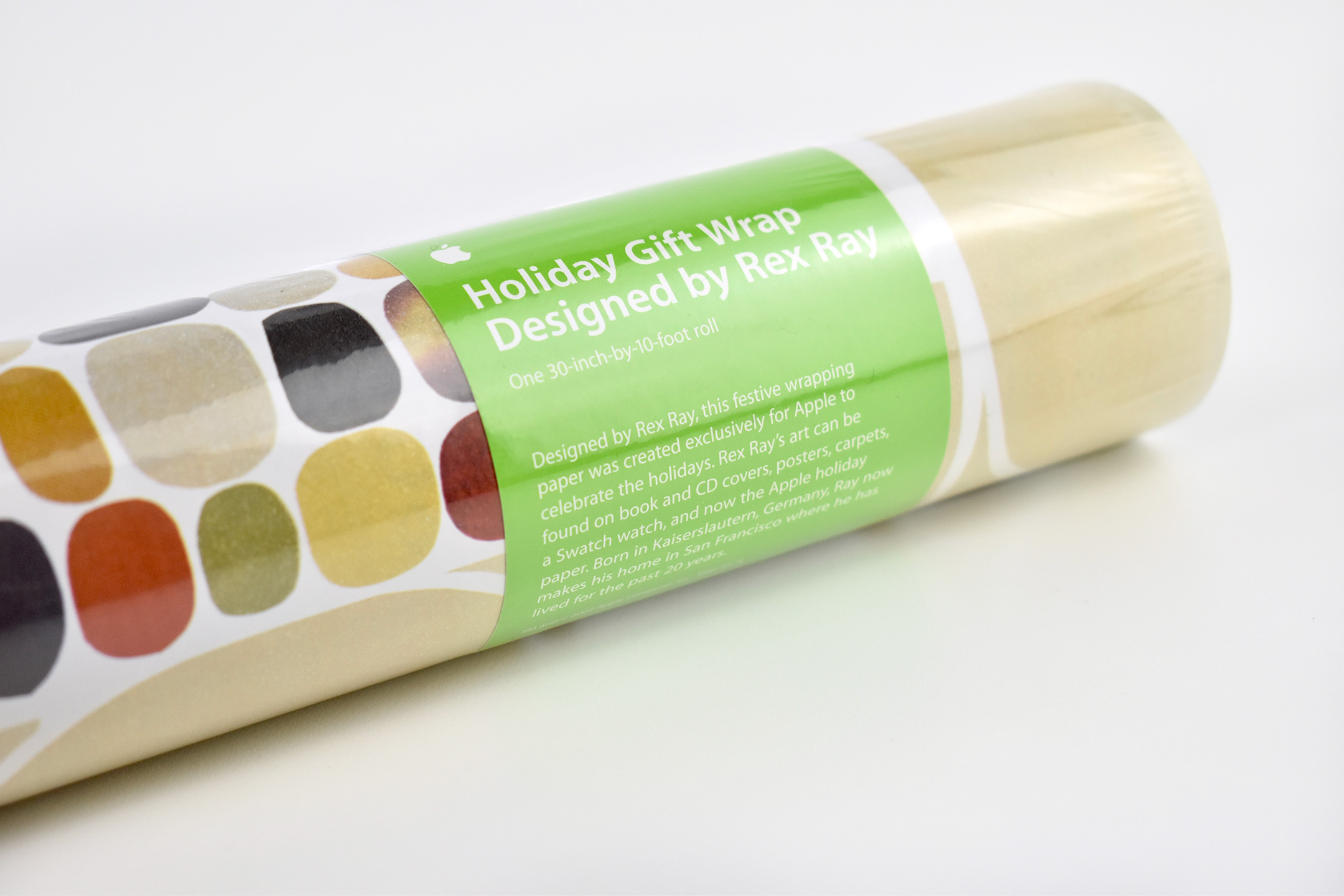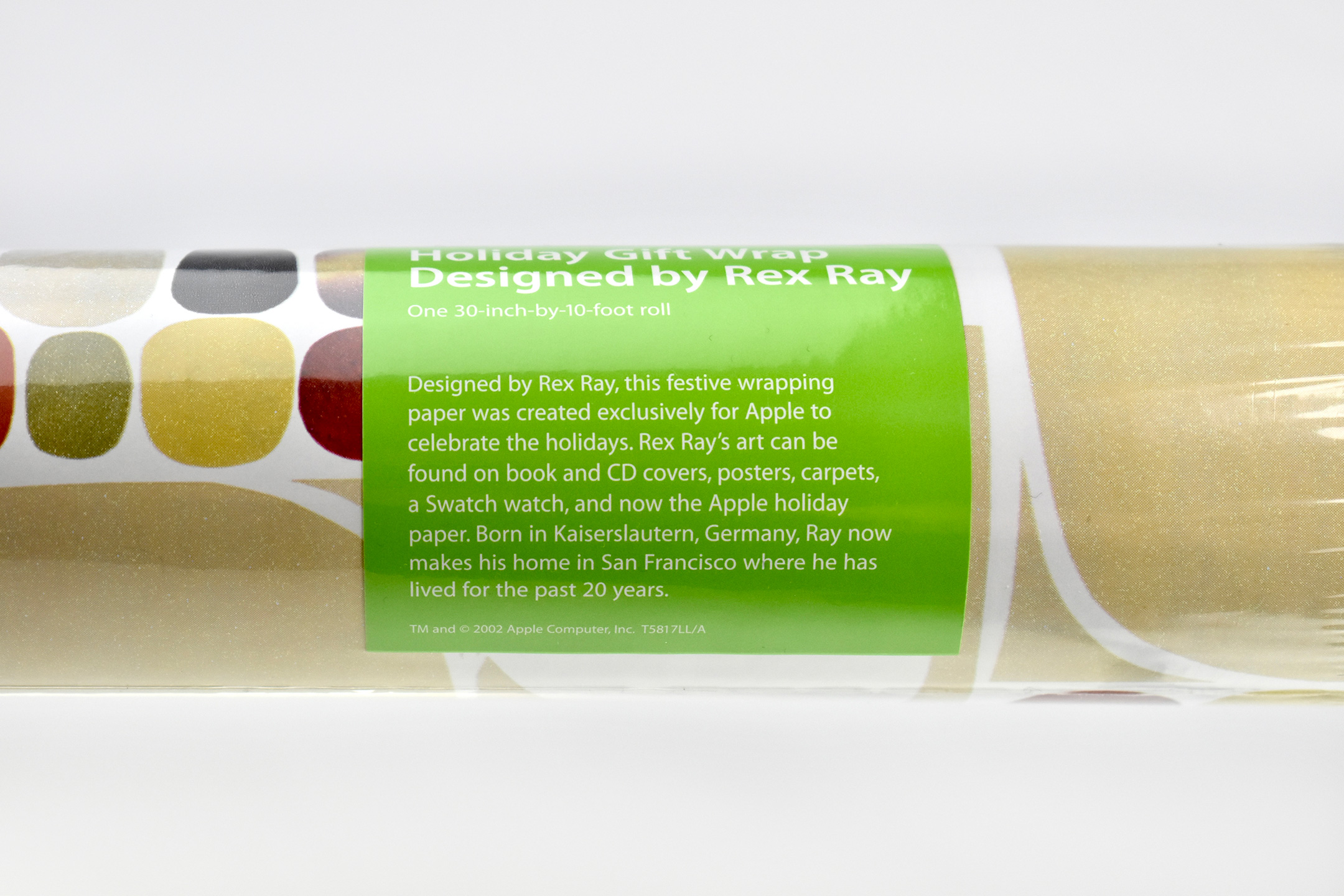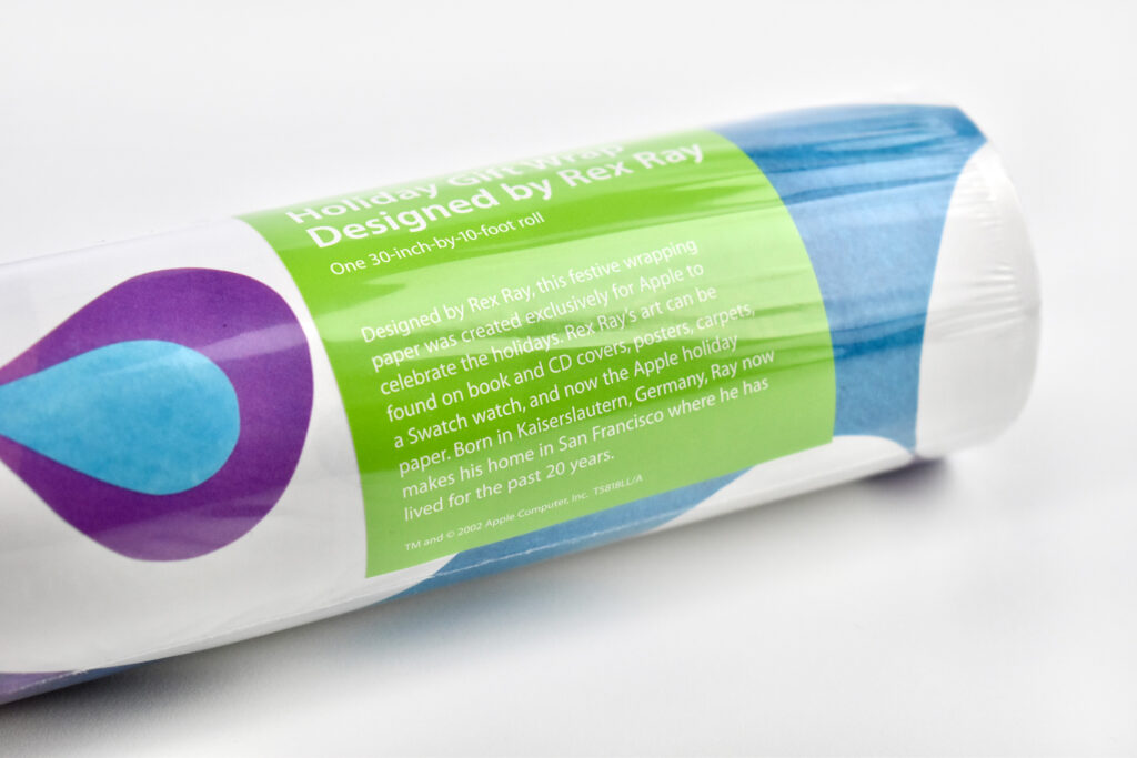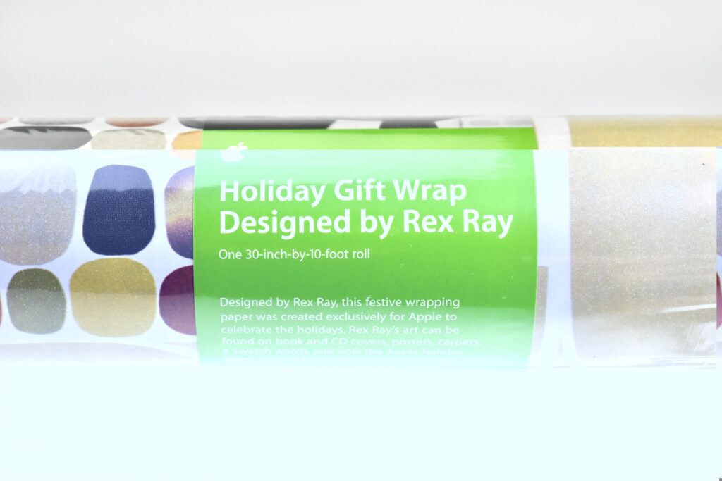 The label on the rolls of gift wrap were bright green with white text in the Apple Myriad font and matched Apple’s product packaging at the time. The label included a black-and-white headshot of Rex Ray, and the product description:
