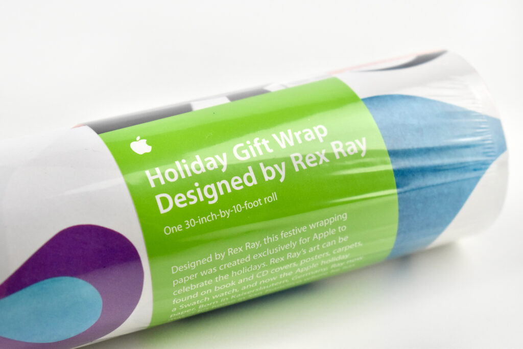 “Designed by Rex Ray, this festive wrapping paper was created exclusively for Apple to celebrate the holidays. Rex Ray’s art can be found on book and CD covers, posters, carpets, a Swatch watch, and now the Apple holiday paper. Born in Kaiserslautern, Germany, Ray now makes his home in San Francisco where he has lived for the past 20 years.”