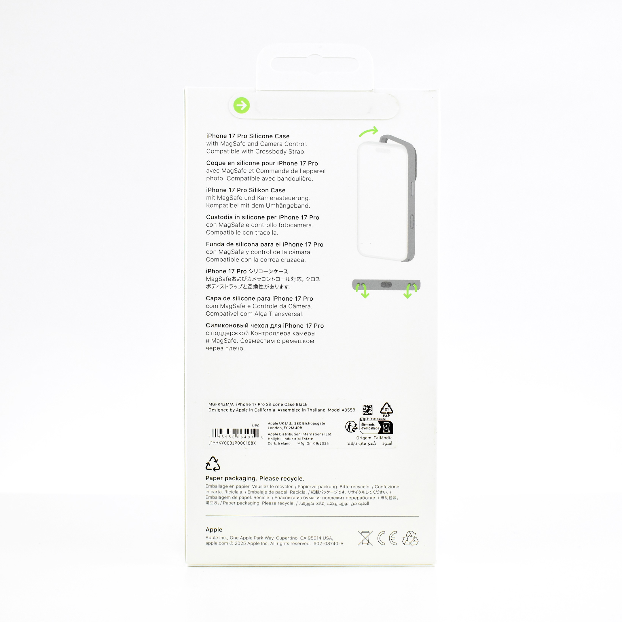 The iPhone 17 Pro Silicone Case was “Designed by Apple to complement iPhone 17 Pro, the Silicone Case with MagSafe is a delightful way to protect your iPhone.” This case also featured a conductive layer to communicate finger movements to the Camera Control button under the volume buttons.