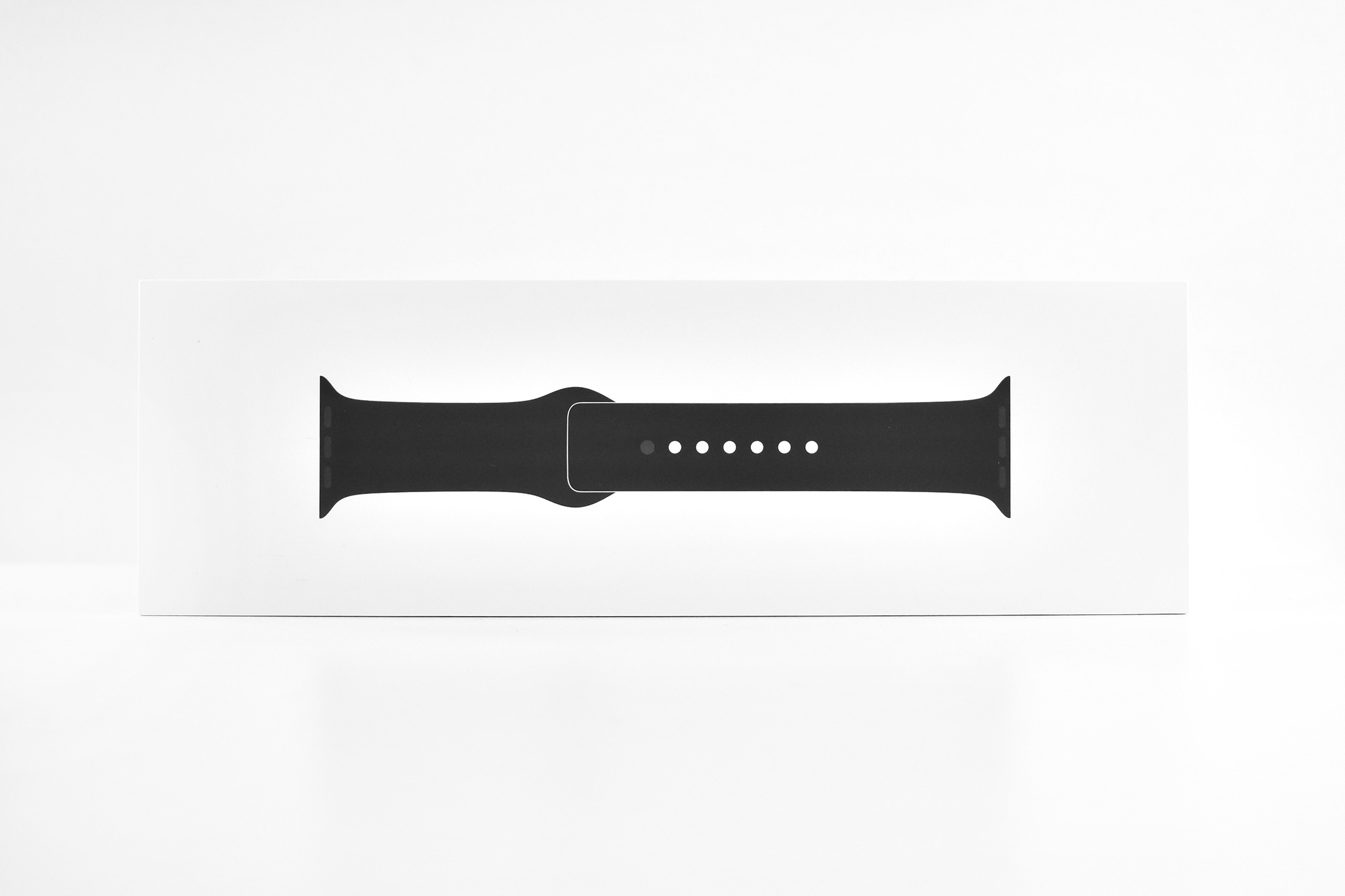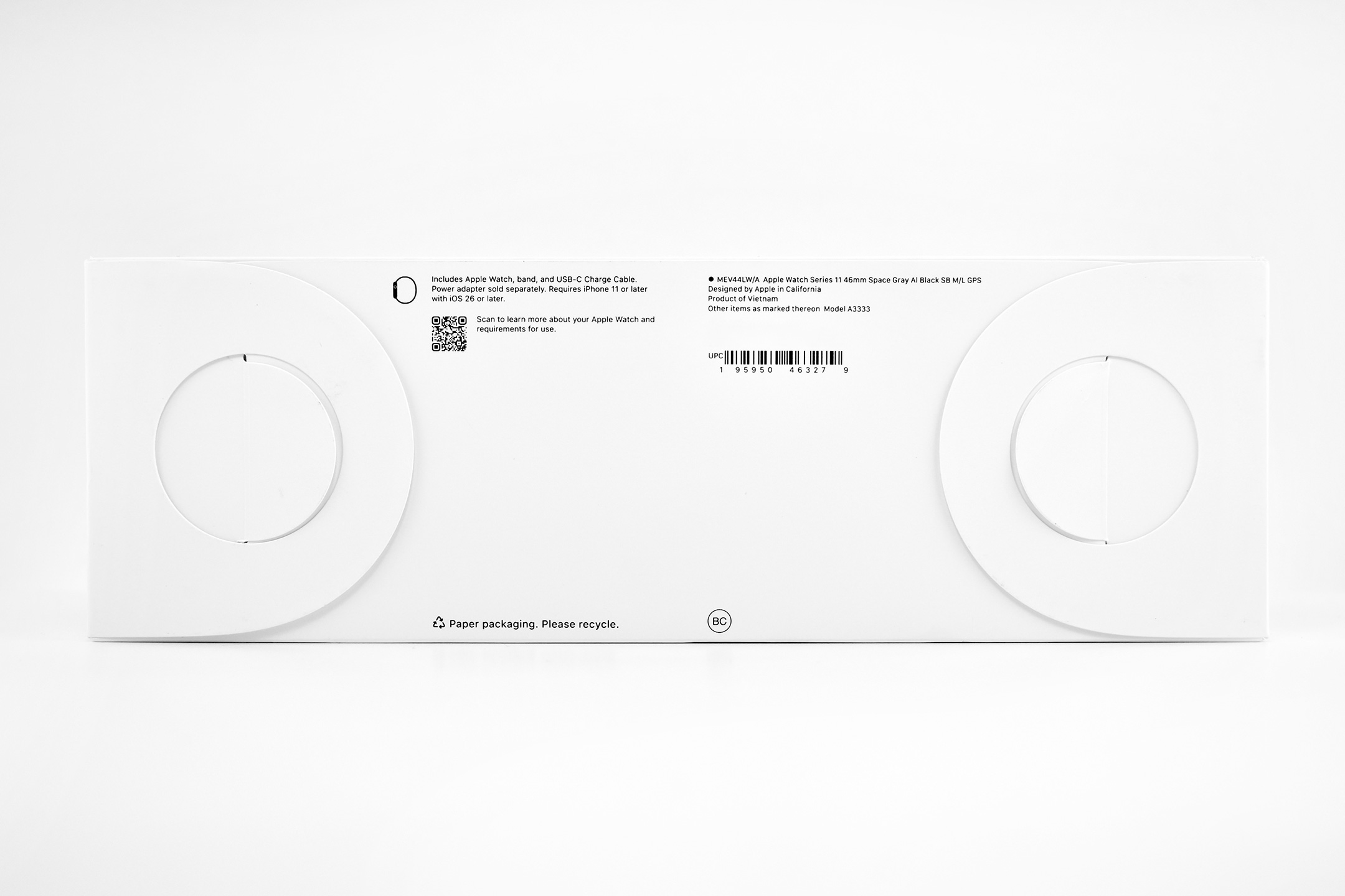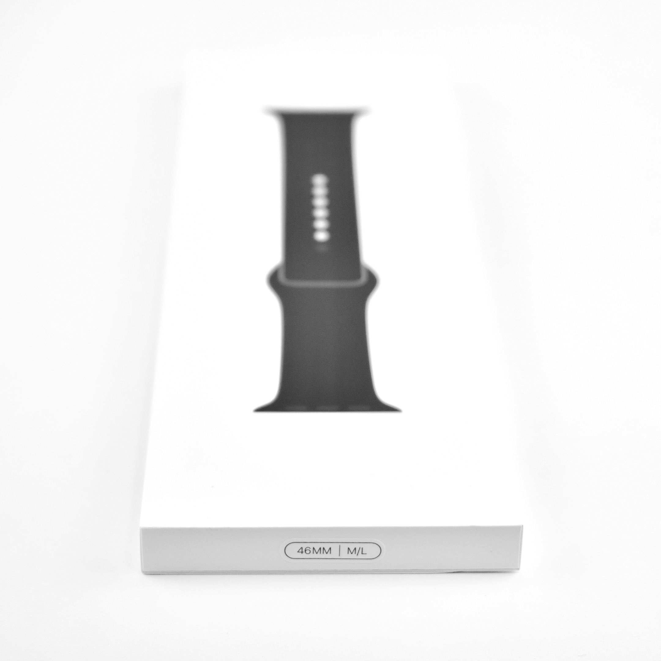This example is in the Aluminum Space Gray option in the 46 mm size. It shipped with a black M/L Sport Band.