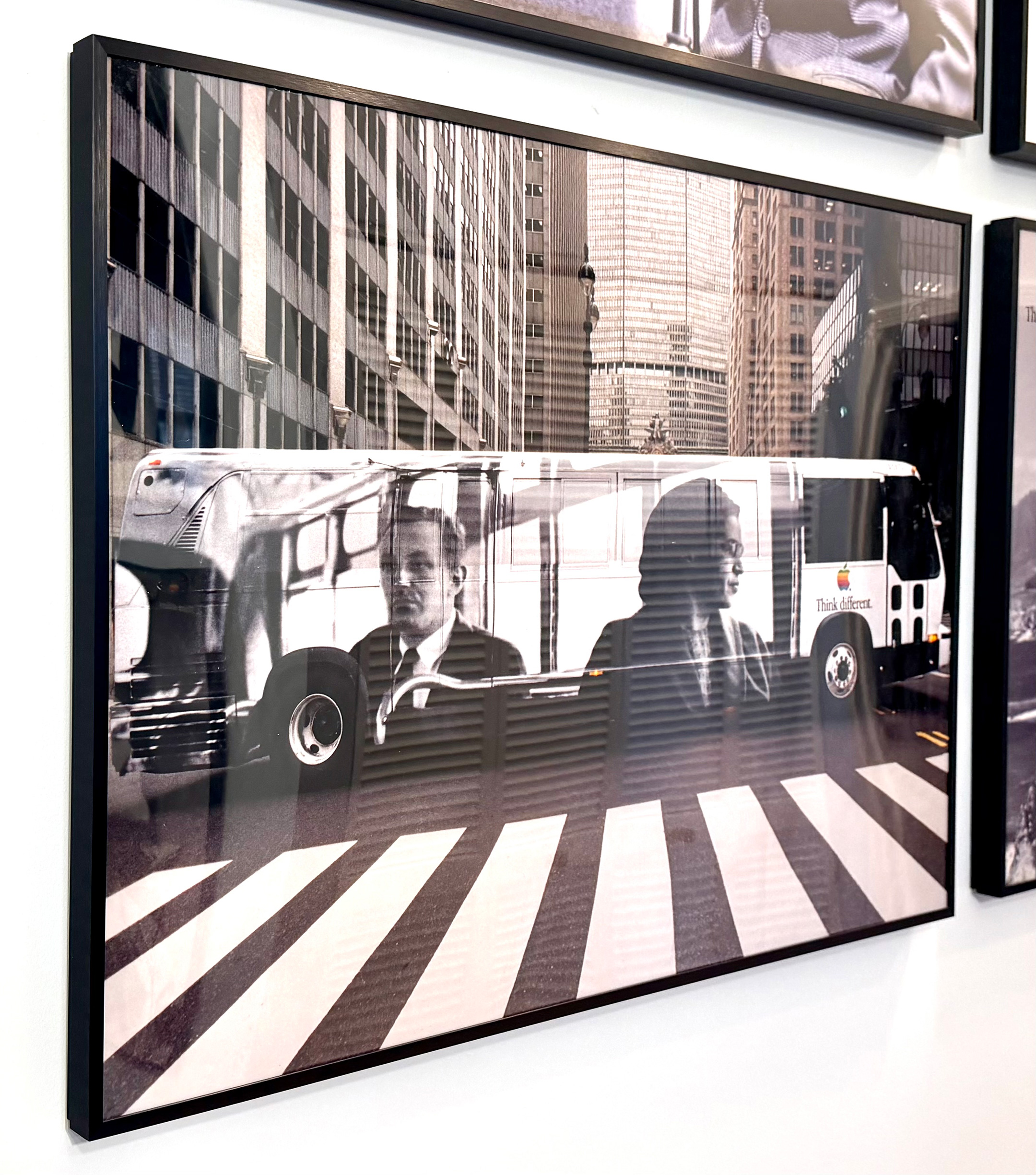 The print and digital ads also did not feature Apple products, just a black-and-white photo, the multi-color Apple logo, and the words “Think different.” One of the creative team members who worked on the campaign described the print concept: “The rainbow-colored logo served as stark contrast to the black and white photography, and, to me, it seemed to make the ‘Think Different’ statement all the more bold.”
