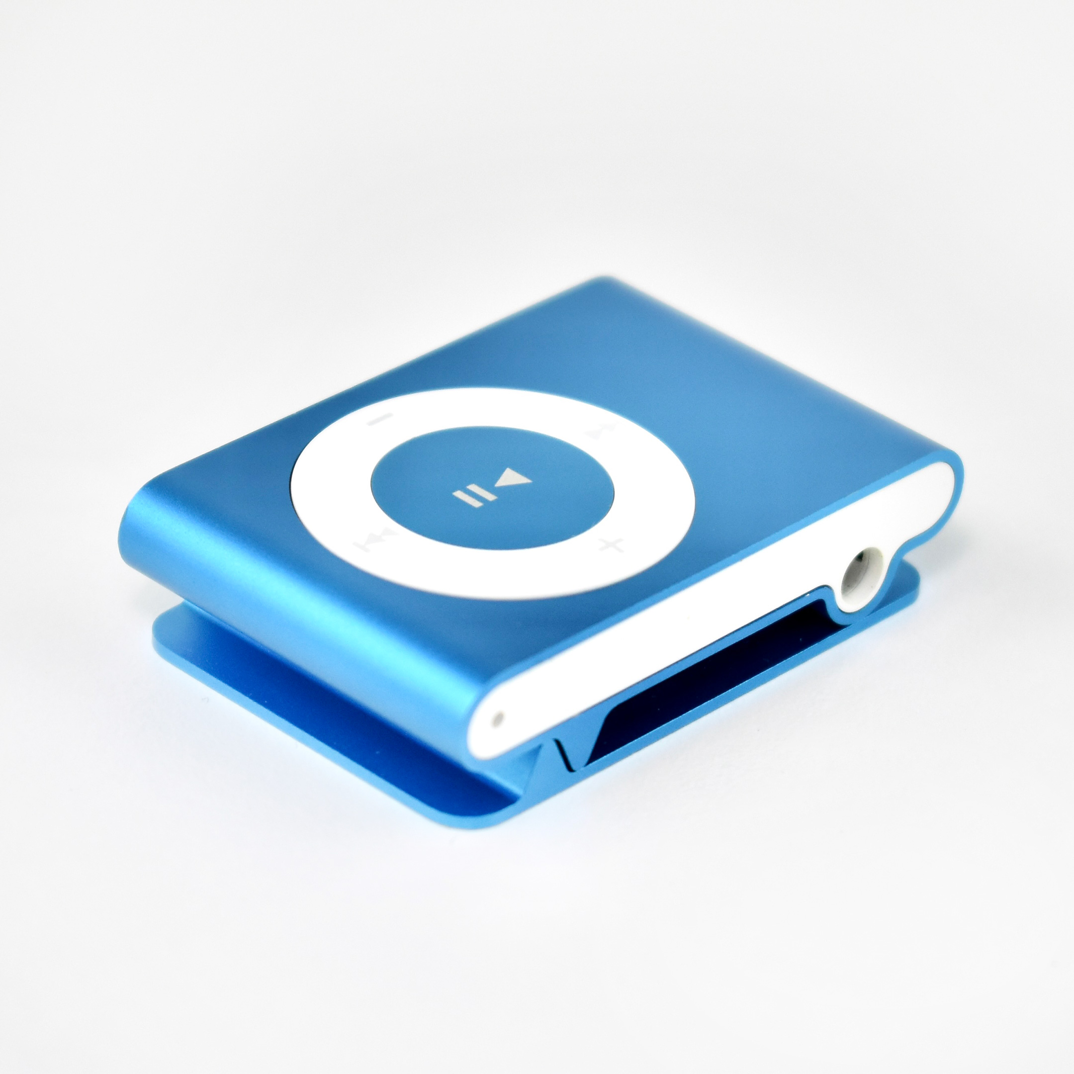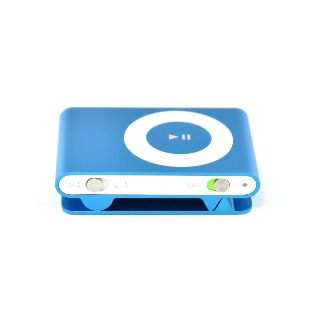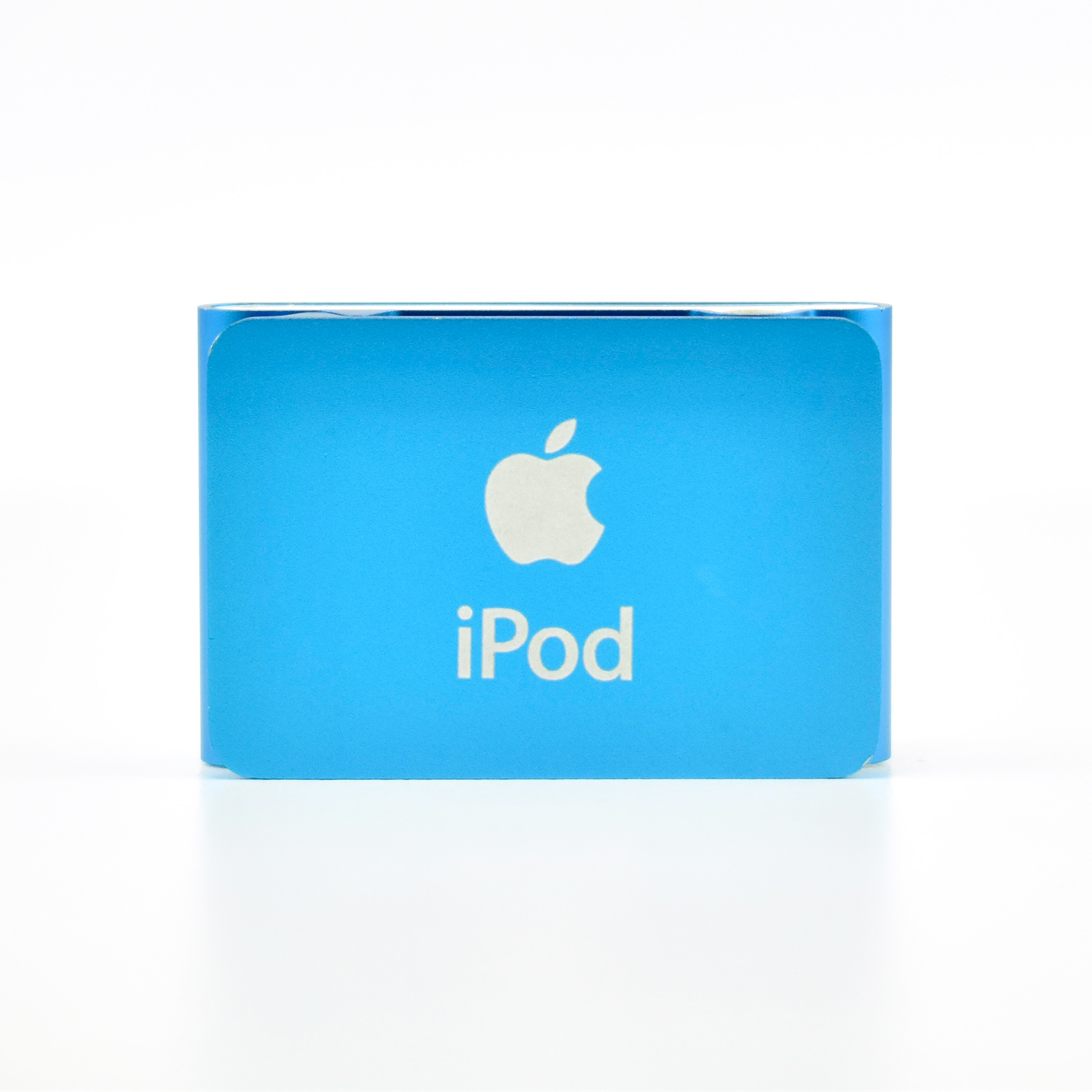 This Generation 2 version of the iPod shuffle was updated to include five colors: silver (original), orange, green, blue, and pink. Also, this revision switched from the old-style “cap” earbuds to a more streamlined earbuds design. This iPod shuffle featured a clip that allowed you to easily attach it to clothing.