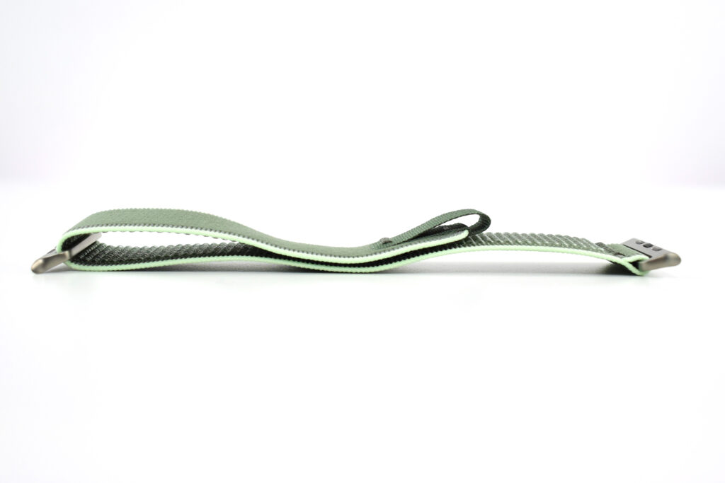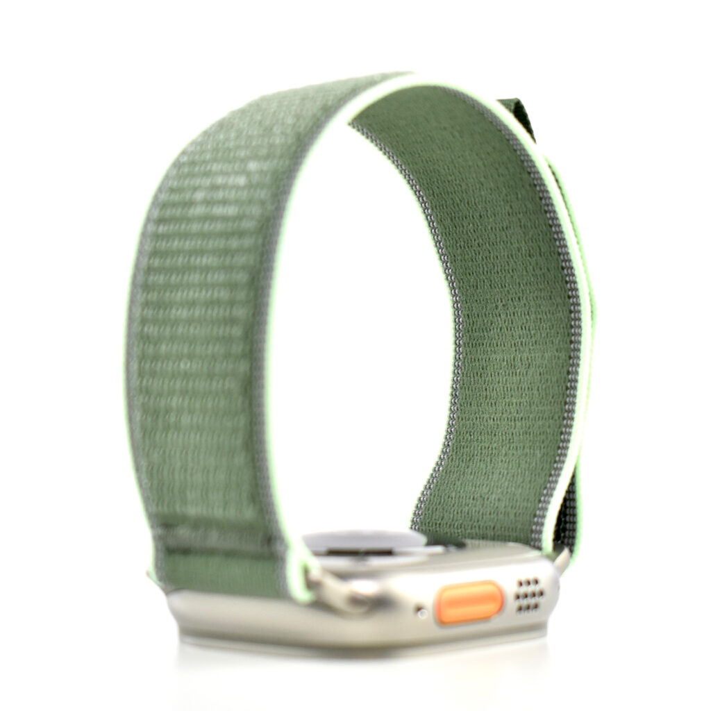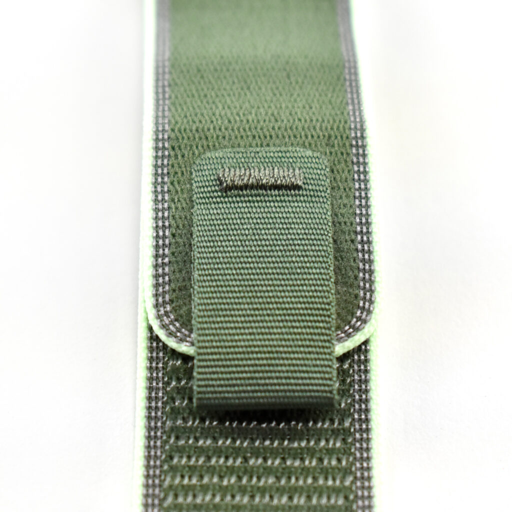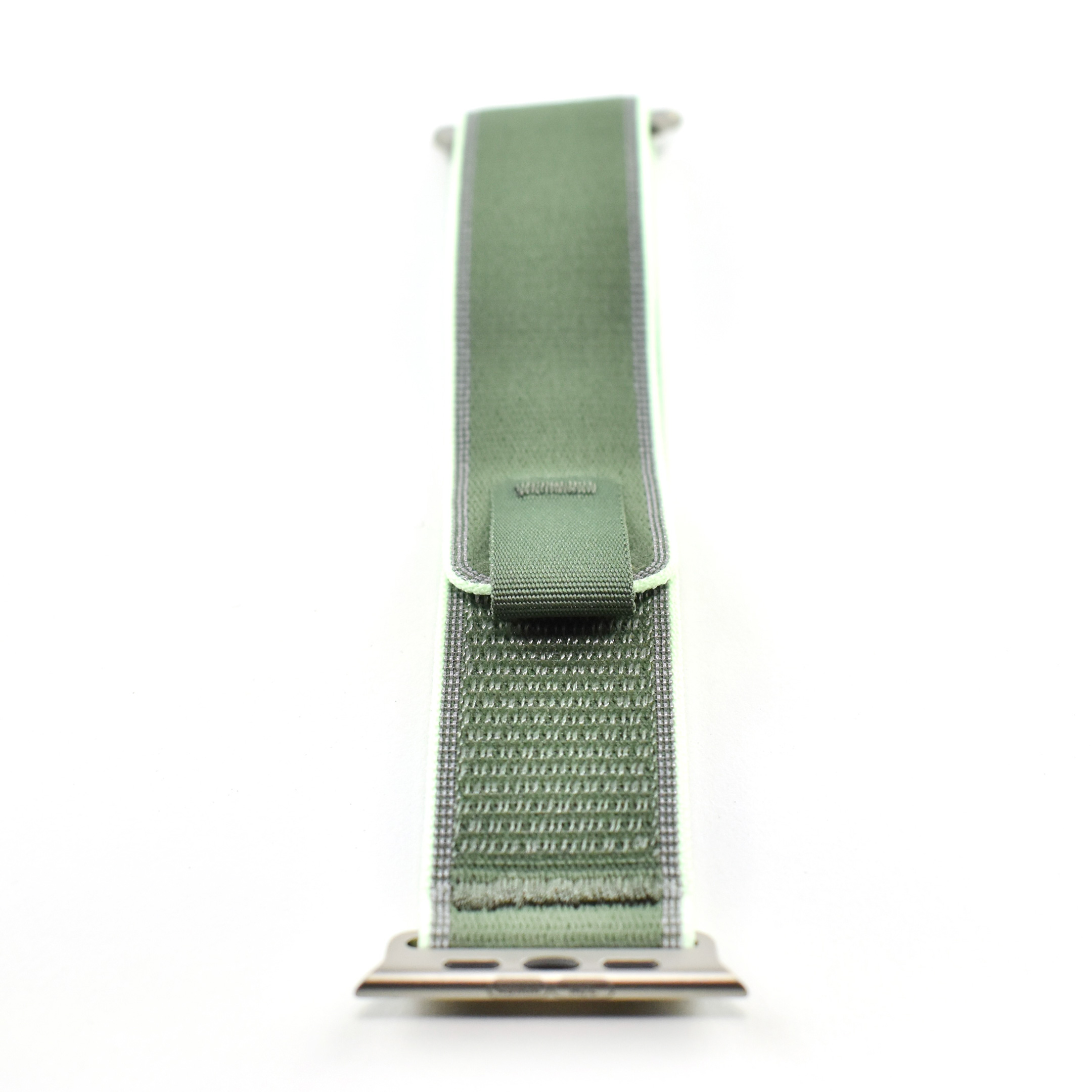 This Trail Loop is Green/Neon Green. The band is primarily dark green with a dark green pull-tab. The outer edges of the band are neon green with a distinctive triple-stitch border in white thread that separates the dark green from the neon green.
